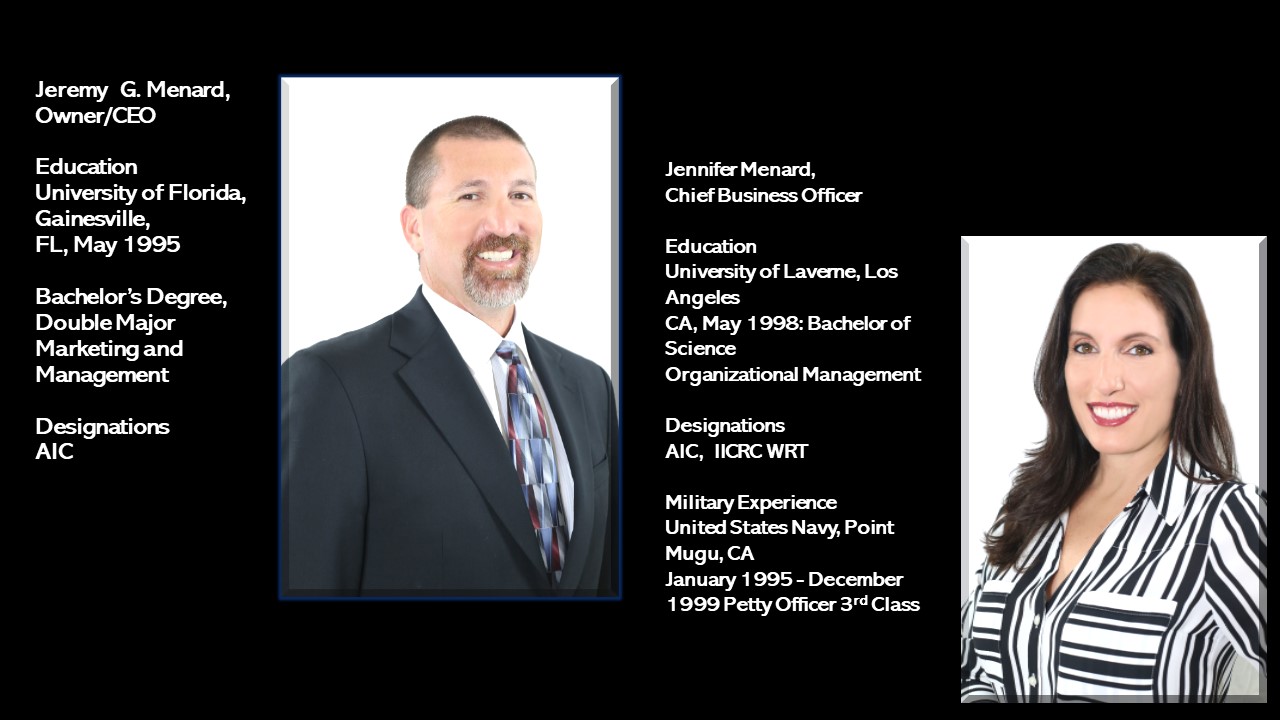 Jennifer Menard serves as the Chief Business Officer. Her focus is business development and operations. We have handled claims as staff adjusters statewide, including CAT claims during the 2004, 2005, 2008 (Ike), and 2016, and 2017 storms. We have remotely handled claims in Texas and Louisiana. Our current coverage area is every county in Florida.